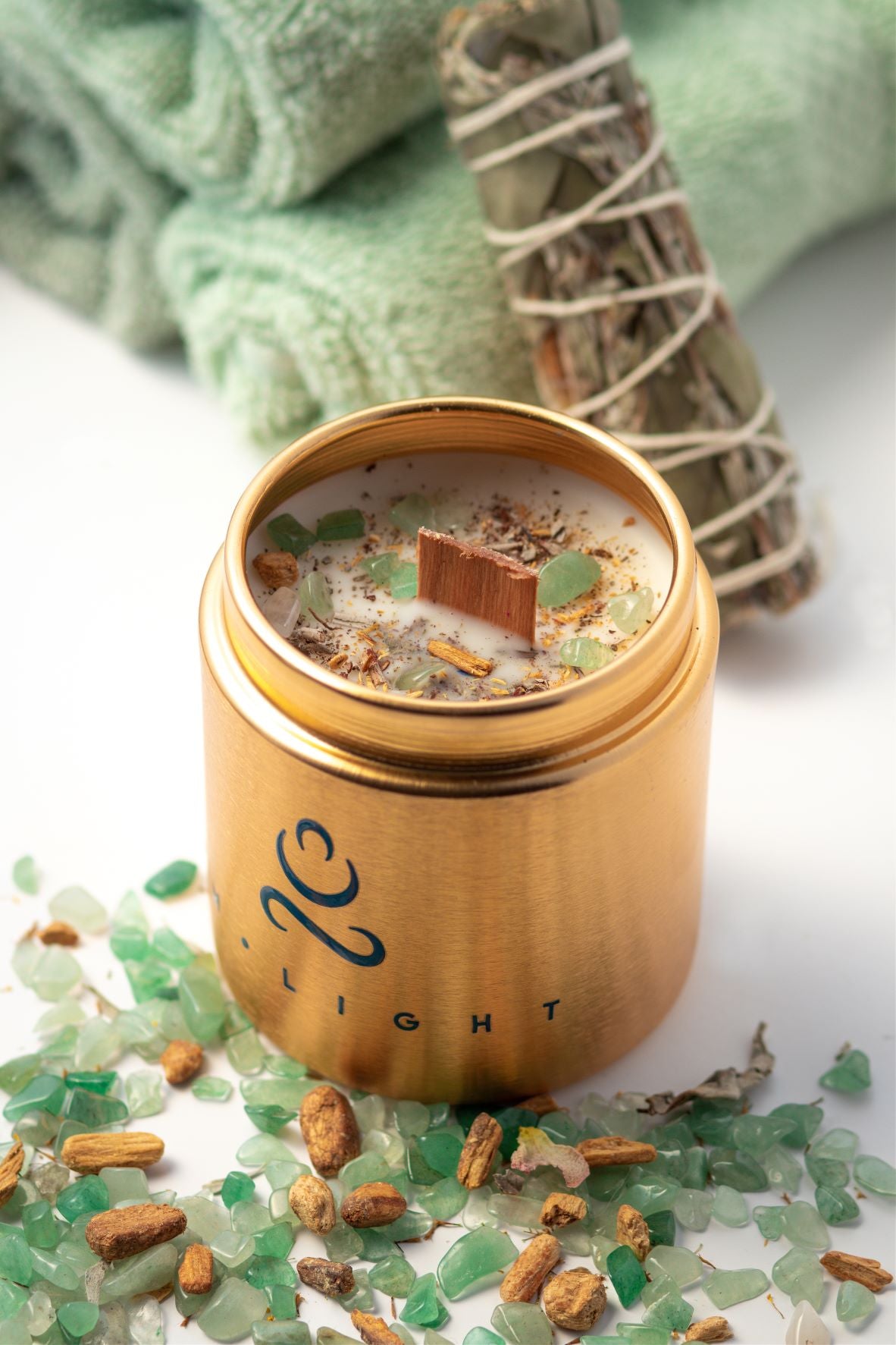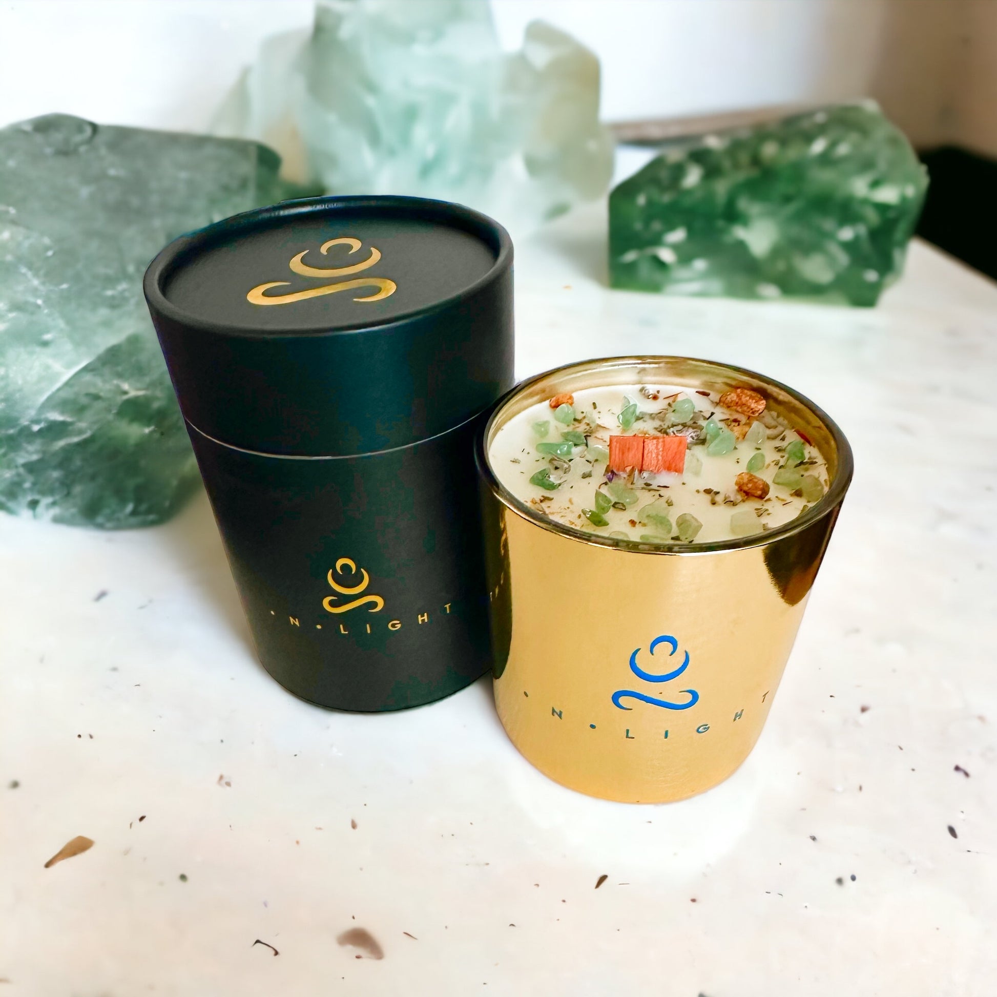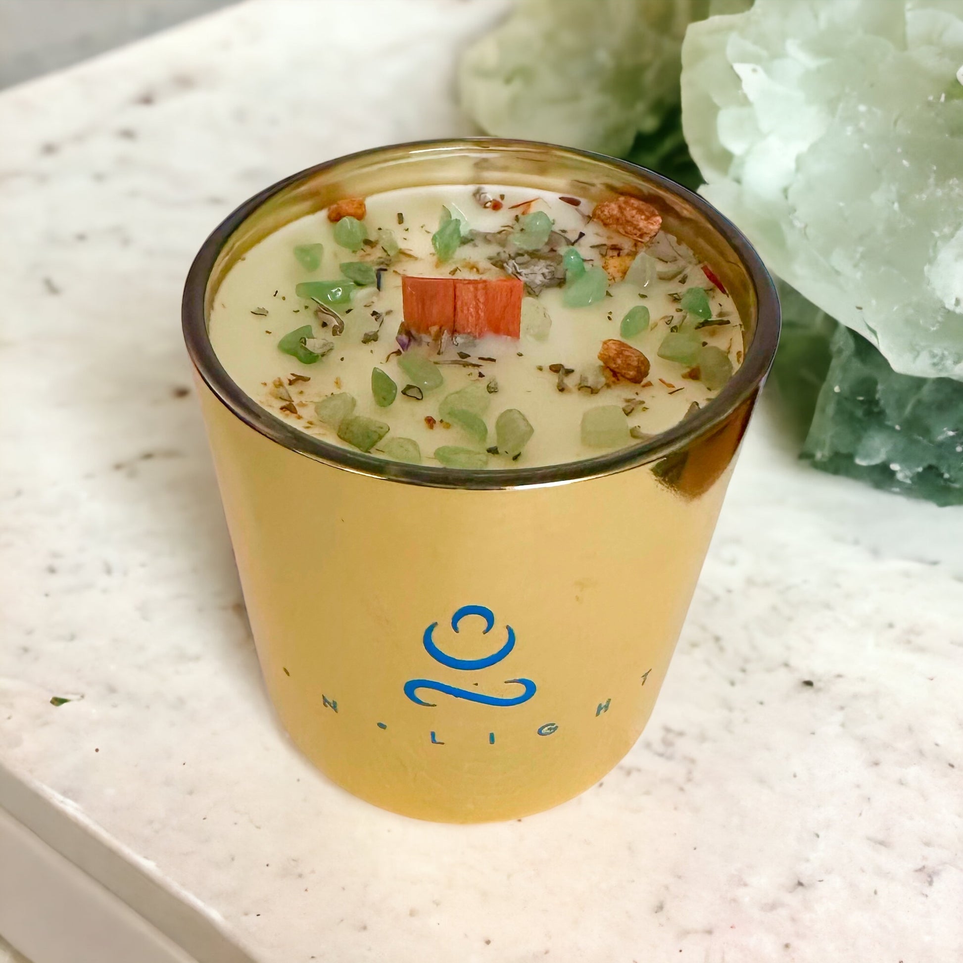 A sophisticated blend of Bergamot offers a soft hint of freshly squeezed citrus with a bold top note of mint. The anchoring vanilla bean and bright minty leaf scent are infused with the crystal Fluorite, offering to cleanse and focusing healing properties.
